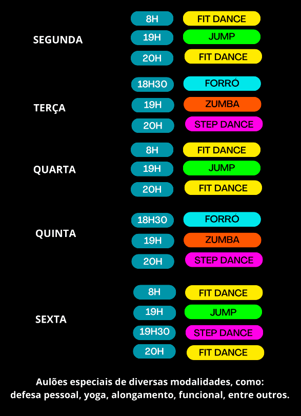 Os horários das aulas coletivas estão disponíveis aqui no site e em nossas redes sociais.